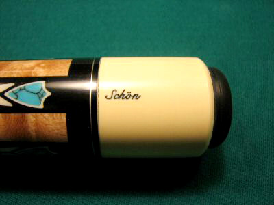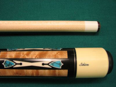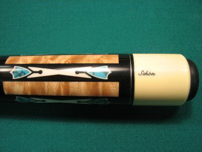 MSRP $1350.00 Exquisite Craftsmanship - This cue is Beautiful. Upgraded with LEATHER WRAP and 3142 Shaft! Cue weighs 19 Ounces. Upgraded 3142 Shaft Looks and Feels Amazing! Collar Matches Perfectly! Cue Butt is in Excellent Barely Used Condition. Constructed of an Bird's-Eye Maple Forearm and Ebony Butt sleeve. Forearm of Cue has Five Long Ebony Points. Each Point Contains Ivory Colored Points and Turquoise Shield Inlays. Butt sleeve of Cue Features Ivory Colored X Inlays with Same Turquoise Shields. Joint Collars are Solid Black with Silver Rings. Cue is made with Over 50 Inlays! Butt cap Proudly states "Schon". This cue has Upgraded Leather Wrap - a $100 Extra.